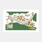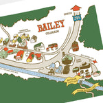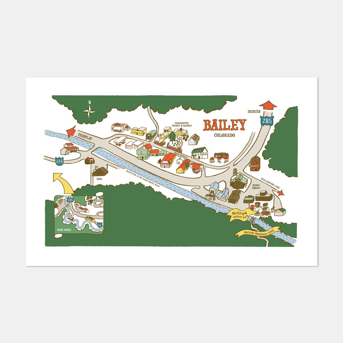 This illustration of downtown Bailey, Colorado captures all of the historic buildings and local landmarks that give the town its charm. The area was once the hunting grounds of the Indigenous Ute and plains tribes, who were displaced by the surge of settlers moving West after the Colorado Gold Rush of 1858-59. The first cabin in Bailey was built in 1864 and can be toured during the summer at McGraw History Park behind Rustic Square.