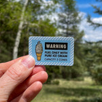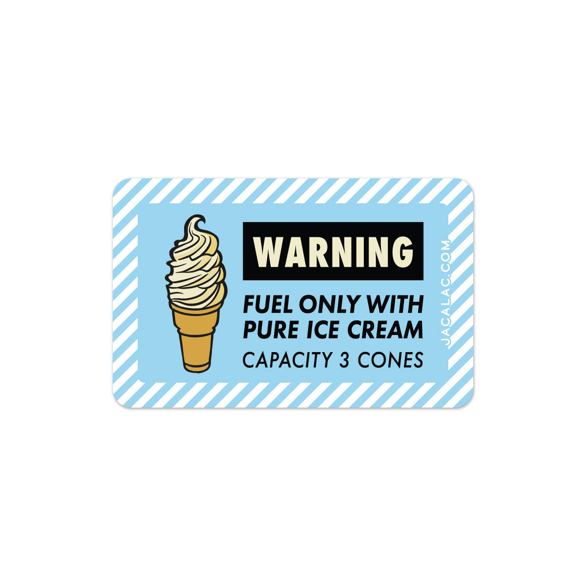 Adorn your belongings with this important warning that ice cream is your only accepted fuel source. The illustrated vanilla soft-serve cone will make it clear to all that you accept only pure ice cream with a capacity of 3 cones per day. Designed to fit the frame of your human-powered vehicle such as a mountain bike or road bike, but the waterproof sticker is also great for water bottles.