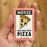 Adorn your belongings with this important notice that pizza is your only accepted fuel source. This sticker prevents unwanted mishaps such as a taco bar or burger stop when the only thing you're craving is a nice hot slice of pepperoni pie. Designed to fit the frame of your human-powered vehicle such as a mountain bike or road bike, but the waterproof sticker is also great for water bottles.
